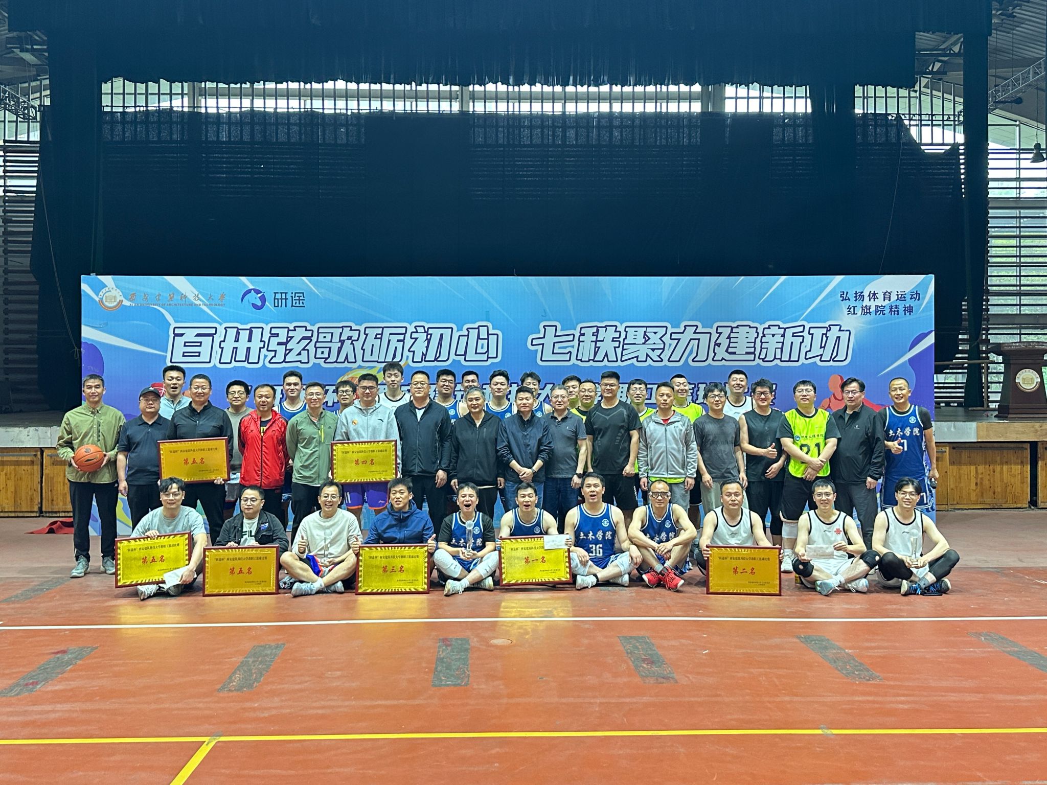 2026年4月19日下午,我校“研途杯”2026年教职工篮球赛在雁塔校区北院文体馆圆满落幕。土木学院摘得赛事冠军,机关代表队斩获亚军,建科学院勇夺季军,体育学院位列第四名;材料学院、环境学院、冶金学院并列获得第五名。