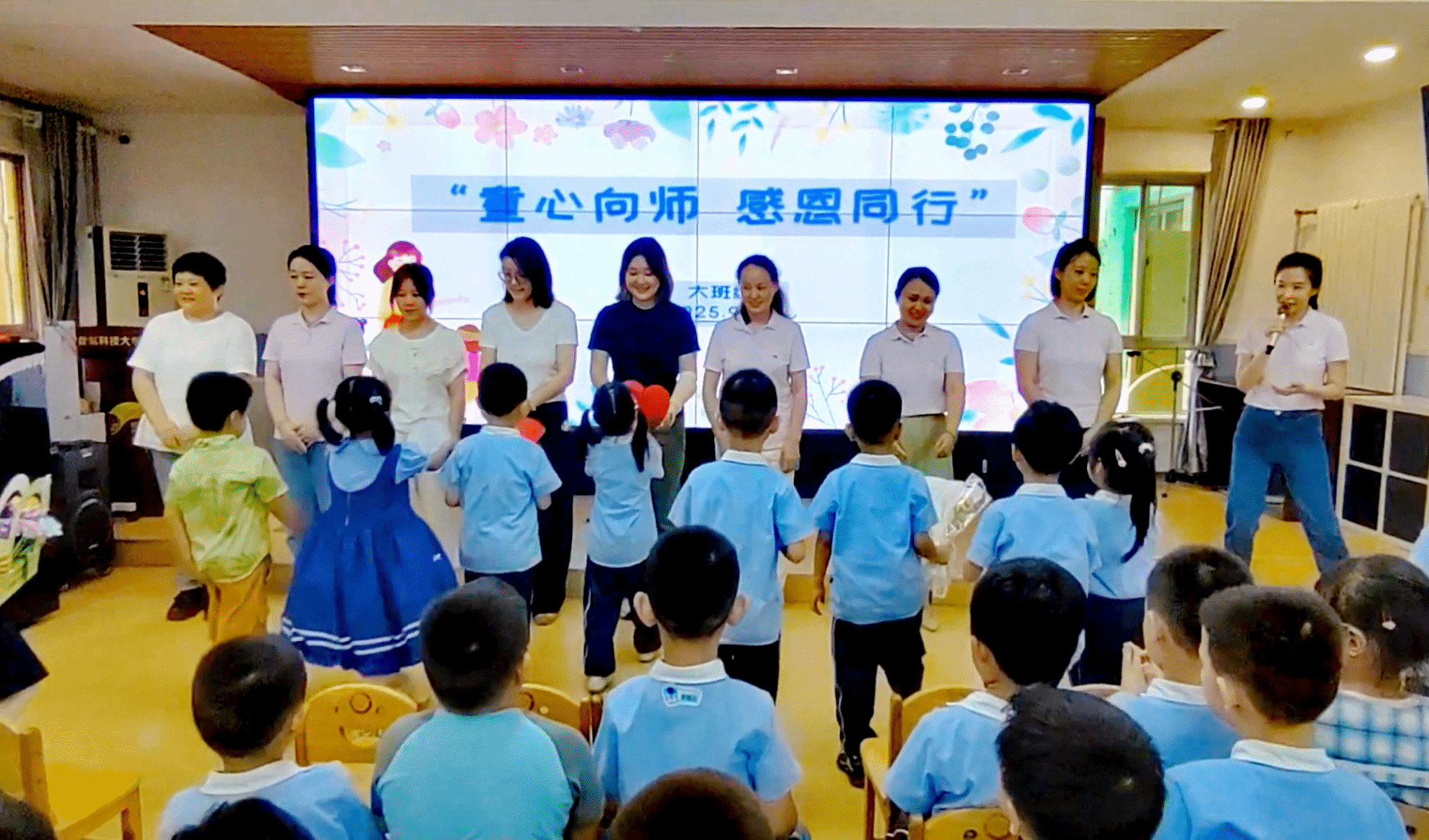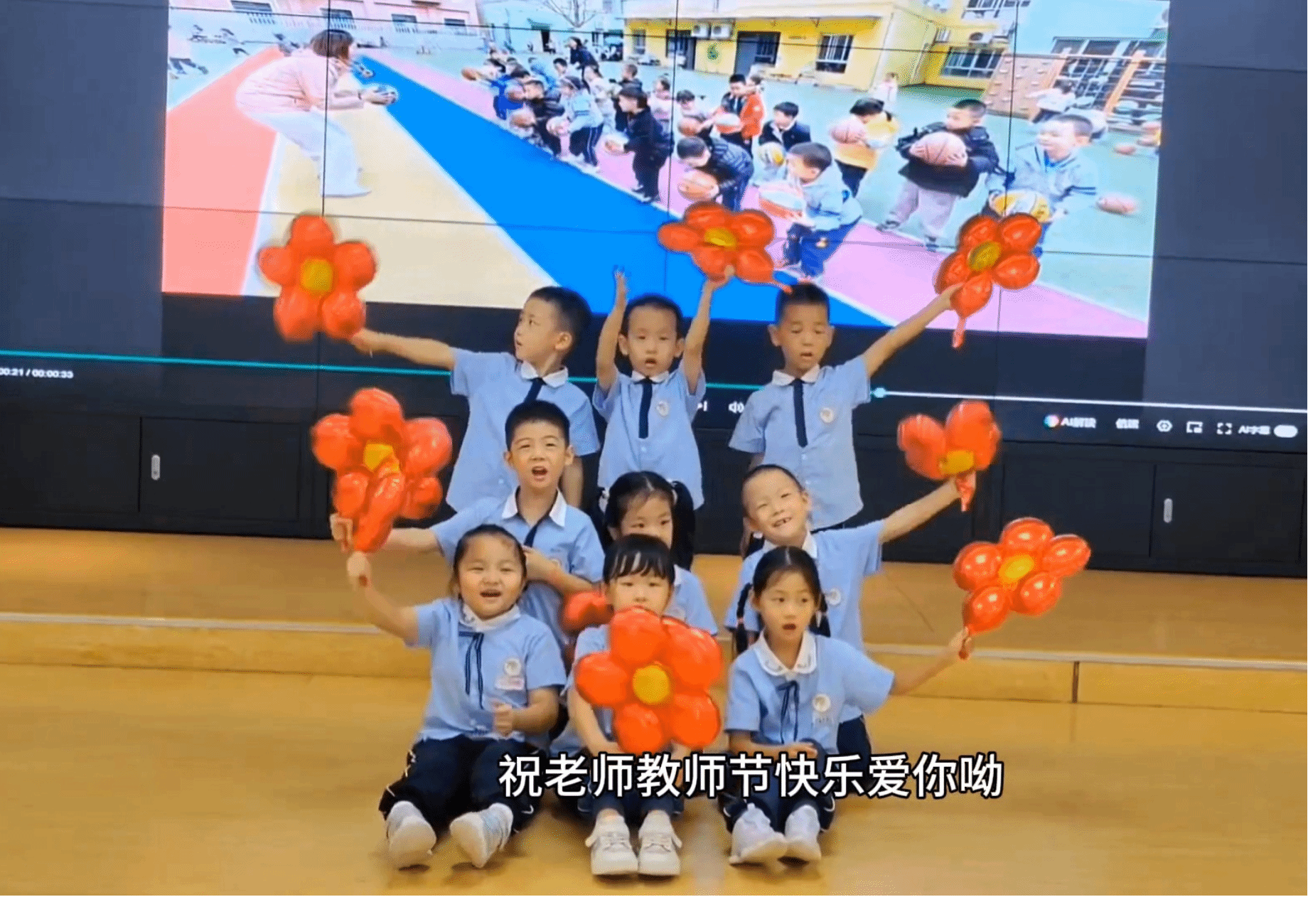 幼儿园围绕“感恩、幸福、成长”的教师节核心主题,精心组织了一场师幼双向奔赴的爱的交流。大班组“童心向师,感恩同行”、中班组“老师说”、小班组“幼儿园老师的一天”三大主题表演环环相扣,活动现场师生表演的舞蹈、歌曲、朗诵等节目精彩纷呈,全园教职工广泛参与、深度体验,在浓厚的活动氛围中感受幼儿对教师的喜爱、感恩和节日祝福。