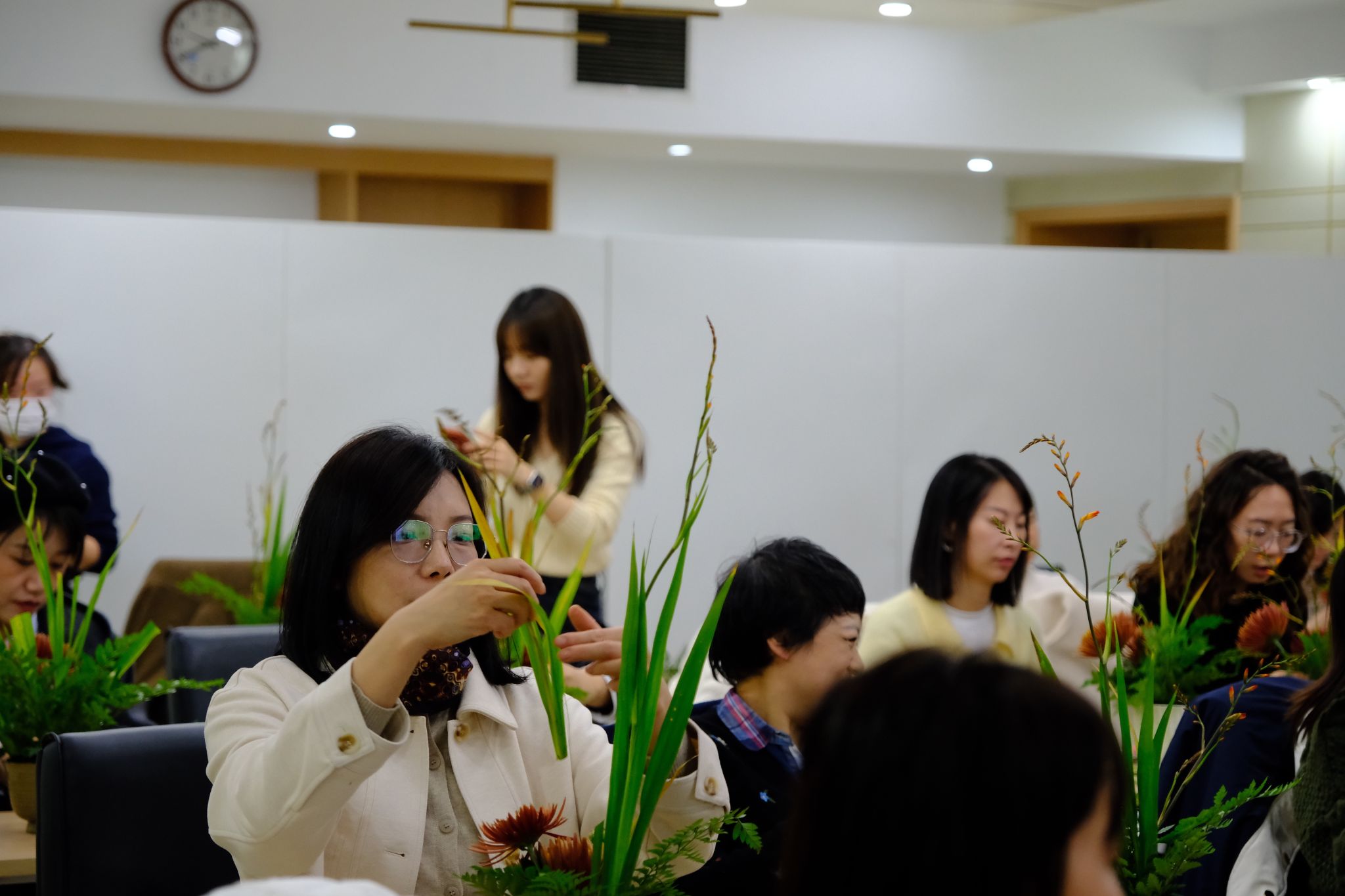 实践环节中,何老师一边一步一步教授插花方式与技巧,助教老师也穿梭于长桌间进行指导。火焰兰的挺拔线条、烟花菊的绽放姿态、高山羊齿叶的舒展形态,在会员们的手中被重新组合。何老师提醒:“中式花道不在于填满花器,而在于通过留白展现生命力。”